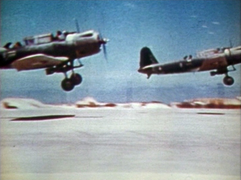WWII – Midway, Marine SB2U-Vindicator dive-bombers take-off 4 June 1942